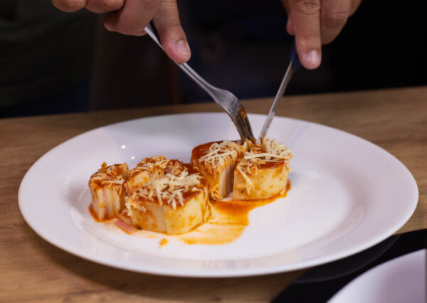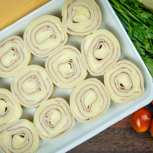 Massa fresca tipo rondeli , recheado com presunto, mussarela e requeijão.